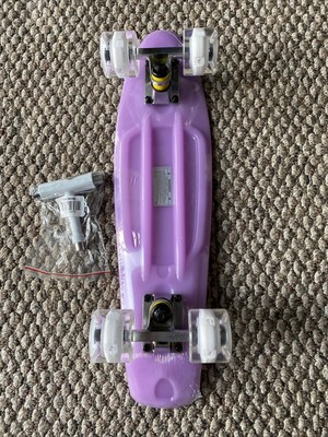 Plastic Penny Size Board 22" PEACH DECK THAT GLOWS IN THE DARK, WHEELS CLEAR LED MULTI COLORS trucks SILVER New. Condition is New. WHEELS CLEAR WITH IMBEDDED ... more LED LIGHTS THEY TURN ON MULTI COLORS WHEN SPINNING 60mm 78a.